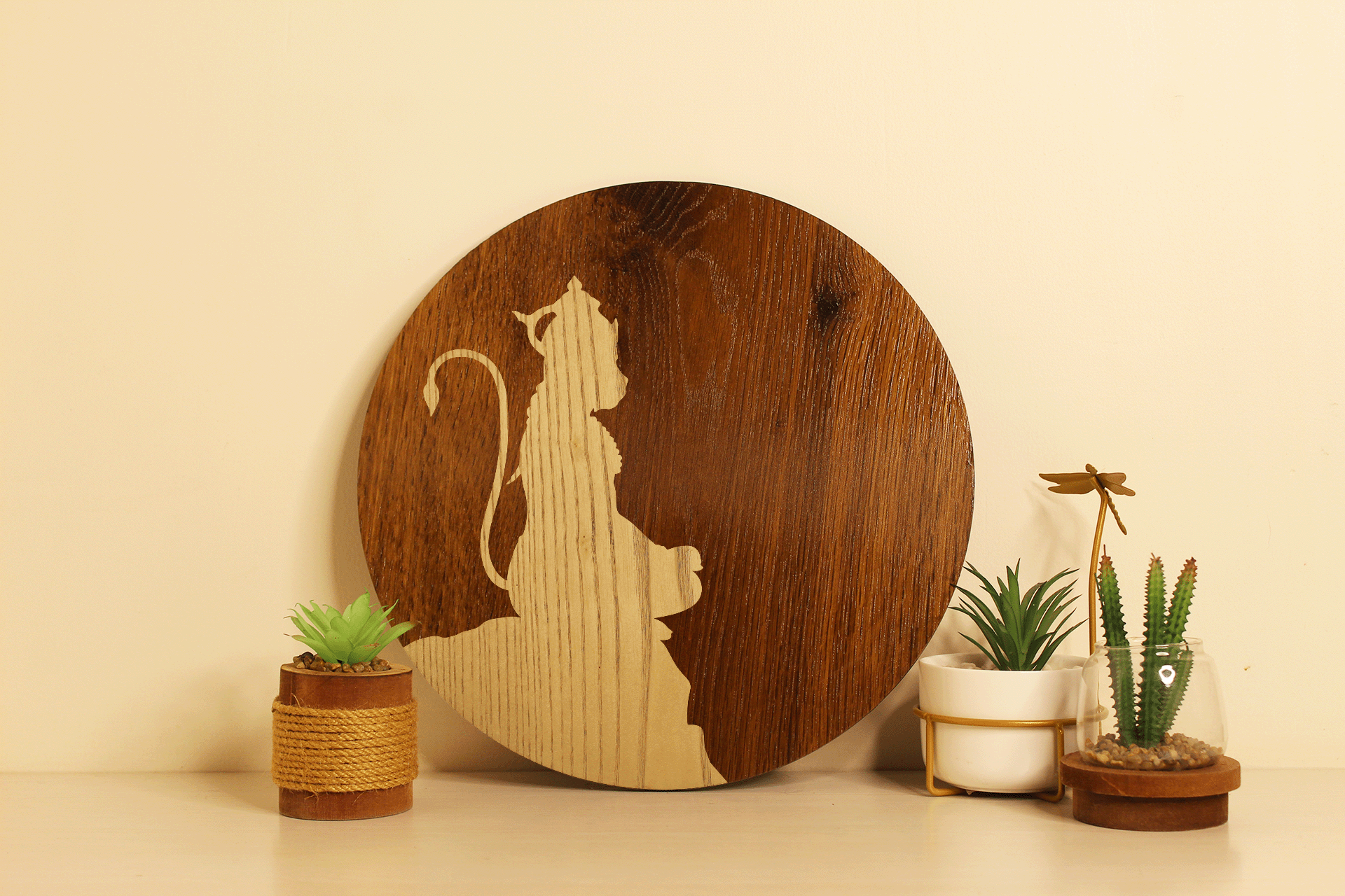 Design Highlight: The serene silhouette of Hanumanji in a meditative pose is precision-cut to reveal the natural two-tone grain, creating a calming, earthy aesthetic.