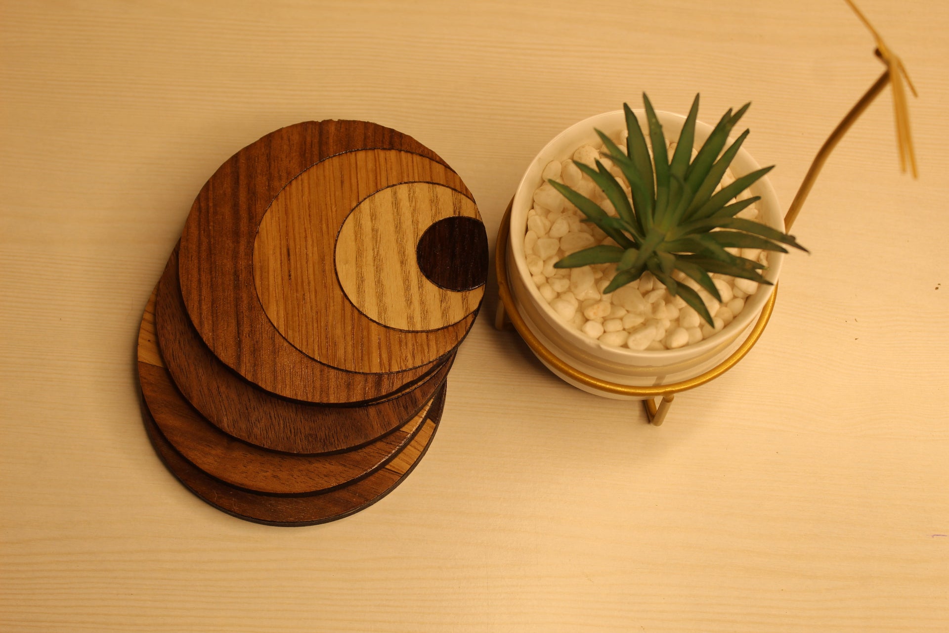 Inspired by the beauty of celestial movements, the Lunar Eclipse Coaster Set brings cosmic elegance to your table. Handcrafted from 6mm HDF with contrasting veneer inlays, each round coaster features layered arcs resembling the phases of the moon. A smooth melamine polish enhances the natural grains while protecting against heat, stains, and scratches.